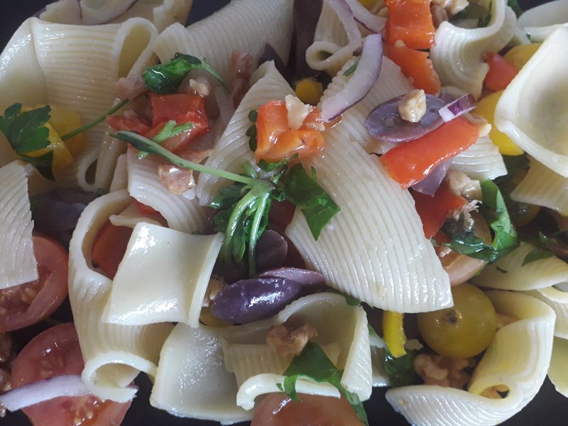 בזיליקום.שרי.פלפלים קלויים.זיתי קלמטה ואגוזי מלך.