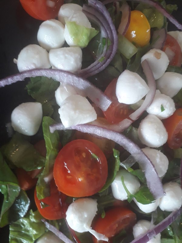 עליי בייבי . עגבניות שרי טריות.בצל סגול .בייבי מומצרלה ובזיליקום.