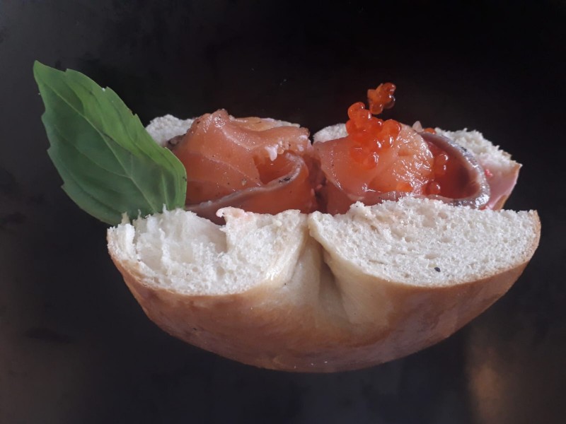 12 חצאי בייגל צרפתי גבינת פילדלפיה סלמון מעושן בצל סגול ועלי חסה טריים